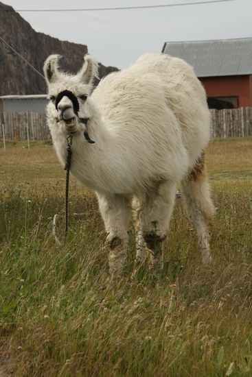 Wir waren in El Calafate ja schon Einiges in Sachen Windstaerke gewoehnt, als wir aber in dem 275 km entfernten Nest El Chaltèn aus dem Bus klettern, sind wir auf die Wucht der Windboeen nicht gefasst. Wir stemmen uns gegen die Naturgewalten und schaffen es zur wenige Meter entfernten Unterkunft, ohne davon zu fliegen. Die im Nachbargrundstueck angepflockten Lamas beaeugen uns belustigt mit ihren bezaubernden Foenfrisuren.