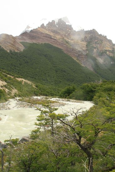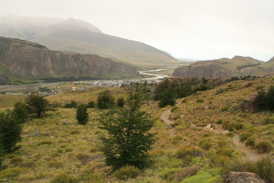 El Chaltèn wirkt charmanter als El Calafate. Das Auge kann sich wieder an den umgebenden Bergen mit etwas mehr Vegetation festhalten. Der Preis dafuer ist ein standliger Nieselregen, der vom Wind durch die Luft getrieben wird.