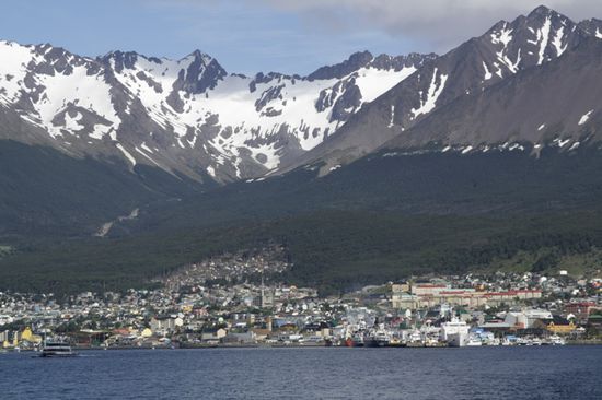 Wenn man aber innehaelt und zurueckschaut, hat man diesen Blick ueber die Stadt, den Beaglekanal und die Berge, die schon wieder zu Chile gehoeren.