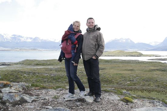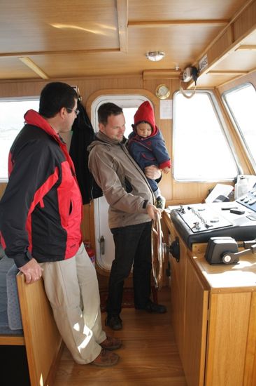 Eine Bootstour auf dem Beagle-Kanal erleben wir bei herrlichstem Sonnenschein und koennen unsere Nasen in den Bugwind halten. Stephan darf auch mal Kapitaen mimen und unser Toechterchen betrachtet fasziniert die vielen "Uhren" an Bord.