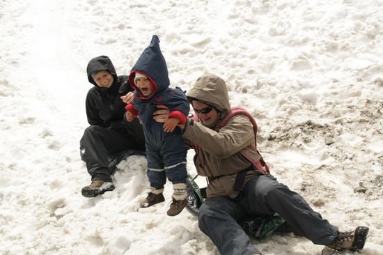 Fuer den Schnee finden wir auch noch eine passende Verwendung. Auf Riesentueten rutscht die ganze Familie den "Rodelberg" hinunter. Stephan muss es natuerlich uebertreiben und endet mit nassen Fuessen im Gletscherbach.