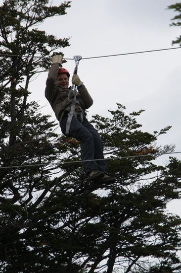 Tarzan spielen ist was Feines! Da es an Lianen fehlt, laesst sich mein Mann mehrfach mit Seilen absichern und saust behelmt von Baum zu Baum.