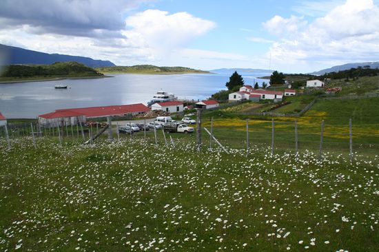 Mit einem Mietwagen brausen wir zur Estancia Haberton, dem vermutlich historischsten Ort auf Feuerland. Hier lebte Thomas Bridges, ein Pionier der ersten Stunde, der auch einen guten Draht zu den Ureinwohnern hatte. Die Estancia kann ausser mit ihrer extrem schoenen Lage nicht mit viel mehr punkten, obwohl es sicherlich viele interessante Dinge zu erkunden gaebe . Mit wenig Begeisterung zeigt uns ein Touristenfuehrer Garten, Friedhof und einige Gebaeude der Farm.