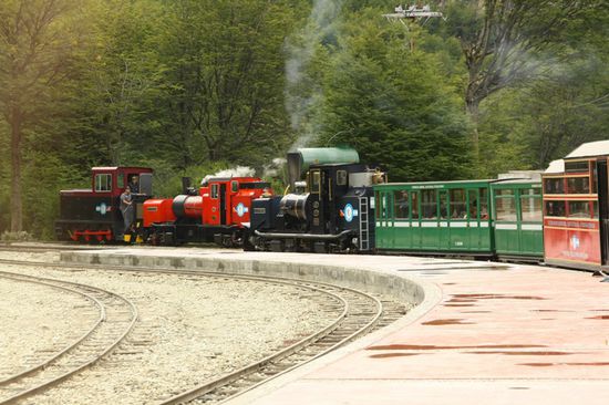 Und als Hoehepunkt des Tages erleben wir noch die Abfahrt des Tren del Fin del Mundo, des Zuges vom Ende der Welt. Urspruenglich als Zug fuer den Transport von Gefangenen zur Forstarbeit gebaut (Feuerland war Strafkolonie), wird ein Teil der Strecke heute als touristische Kleinbahn genutzt.