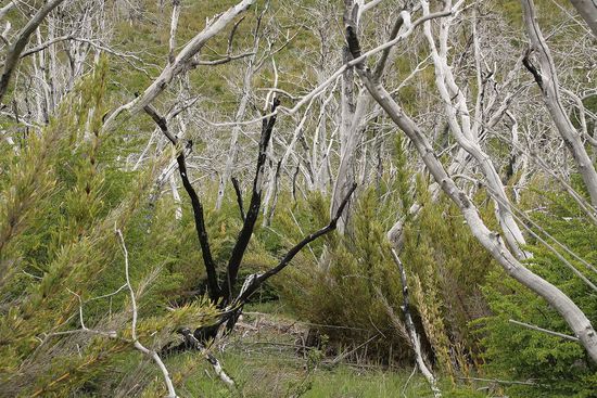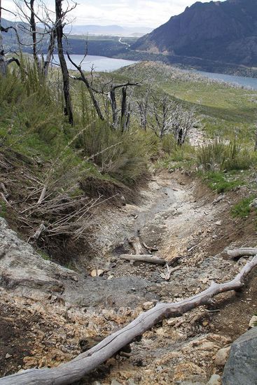Eine erste groessere Wanderung am Cerro Catedral, dem eigentlichen Wintersportberg, gibt gespenstische Blicke auf einen vor Jahren abgebrannten Wald und wieder wunderschoene Ausblicke auf einen weiteren See, den Lago Guitterez frei.