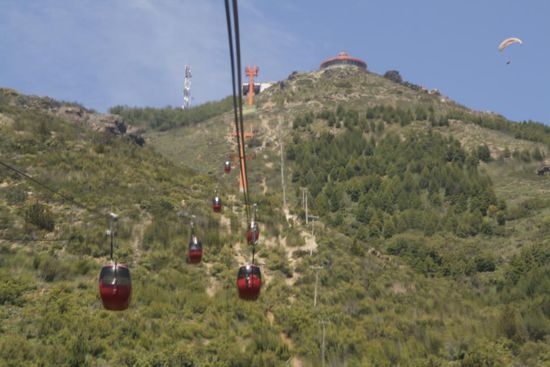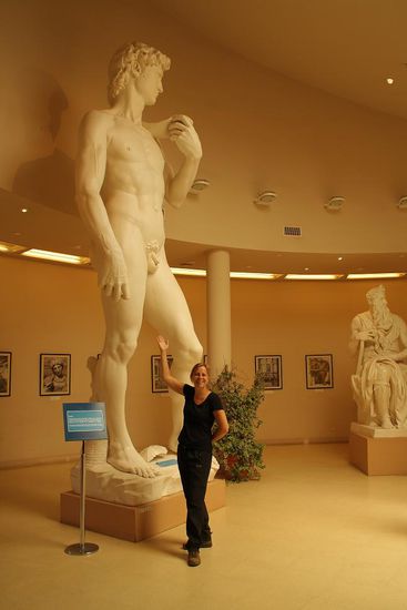 Mit der Seilbahn lassen wir uns auf den Cerro Otto, Bariloches Hausberg, befoerdern - man kann nicht immer nur wandern. Hier gibt es einen Ueberblick ueber ganz Bariloche und den Nahuel Huapi... ausserdem Kunst: Nachbildungen bedeutender Michelangelo-Statuen. An einem Ort, an dem man so etwas erwartet! Den Ausblick geniesst man uebrigens aus einem Restaurant, welches sich alle 20 min eine Runde gedreht hat - doll, ne?