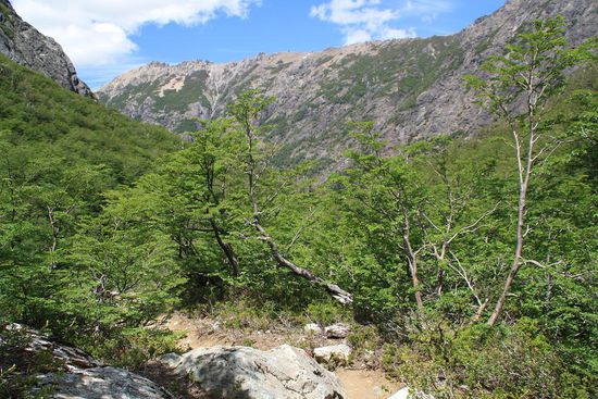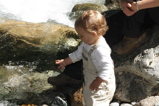 Zunaechst fuehrt der Weg zu zwei Dritteln in einem Flusstal entlang. Wir nehmen uns viel Zeit. Juliane entdeckt, wie schoen es platscht, wenn Steine ins Wasser fliegen.