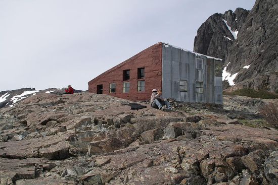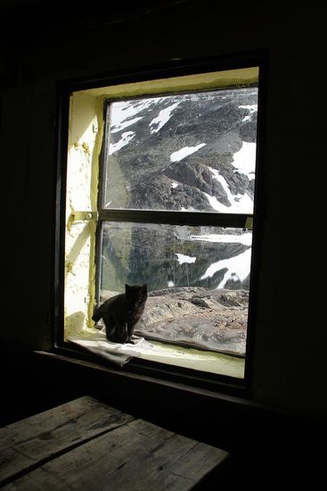 Unsere groesste Sorge bei der Ueberlegung zu diesem Bergausflug war, ob Juliane im Schlafsaal nachts alle wecken wird. Denn alle Wanderer schlafen, wie es sich fuer eine Berghuette gehoert, in einem Gemeinschaftsraum in Doppelstockbetten. Aber sie enttaeuscht uns nicht, sondern schlaeft unter unseren Fliesjacken durch. Wir - eingewickelt in Decken und Schlafsaecken - sind beruhigt und die Mitwanderer sicherlich erleichtert. Am Morgen ist der heftige Wind wie weggeblasen, aber es ist kalt. Den waermsten, weil einzig sonnigen, Platz hat die Katze des Hauses inne.