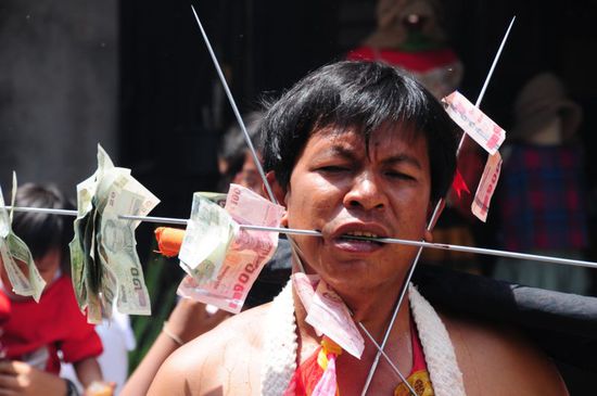 Es war mal wieder sehr laut. Kinder, die auf eine Riesentrommel geschlagen haben, Männer waren als Drachen verkleidet und wieder andere hatten, um ihren Glauben an Buddha und dadurch Schmerzfreiheit unter Beweis zu stellen, Metallspiesse durch ihre Wangen und/oder Ohren gestochen. So richtig kann man das ja nicht nachvollziehen, aber bei einem Mann scheint der Glaube doch nicht so gefestigt gewesen zu sein, denn die Beine haben ganz schön gezittert. Ausserdem war er mächtig durchgeschwitzt, auch unten herum, wenn es denn nur Schweiss war. Auf die Spiessenden, die auf der anderen Seite überstanden, waren bei allen Geldscheine aufgespickt. Jedesmal, wenn ein Shop oder Restaurant passiert war, wurden vor der Tür meterlange Kracherschlangen als Abschluss gezündet. Zwischendurch hat man die sich selbst kasteienden Männer mit Wasser versorgt. Das alles sei für das Glück im neuen Jahr, wurden wir von einer jungen, englisch sprechenden Thai aufgeklärt.