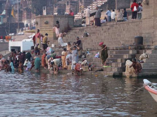 Leider kann ich auch von Benares (jetzt Varanasi) nichts Besseres erzählen. Im Gegenteil, für mich war das die schlimmste Stadt. Gestank, extremst aufdringliche Bettler und Händler überall. Auf dem Ganges schwimmen die toten Kühe. Auch die verstorbenen Kinder (bis zu einem Alter von 5 Jahren) und die Priester werden komplett in das Wasser geworfen. Unser Führer erzählte, man habe 50.000 unterschiedliche Bakterienarten in einem ccm Wasser gezählt. Diese Brühe wird dann von den Leuten auch noch getrunken, wodurch sie allerdings erstaunlicherweise nur selten krank werden. Wir unternahmen eine kleine Bootsfahrt (sicherheitshalber mit Mundschutz) auf dem Ganges. Beim Aussteigen trat ich - wie üblich mit der Kamera am Auge - in einen von den überall herumliegenden Kuhfladen. Ich stellte mich daher mit einem Fuß auf die Treppe direkt am Flussufer. Den anderen Fuß tauchte ich in den Ganges und wusch die Sch... vom Schuh ab. Eine Frau, ca. 1m von mir entfernt, sah mir dabei zu. Sie betete dabei, tauchte unter, faltete die Hände und trank das Wasser von "Mutter Ganges". Inzwischen kam eine von uns zuvor im Boot überholte tote Kuh in ca. 3m Entfernung angeschwommen. Das Alles störte die Frau nicht im Geringsten und sie trank in tiefer Andacht weiter.