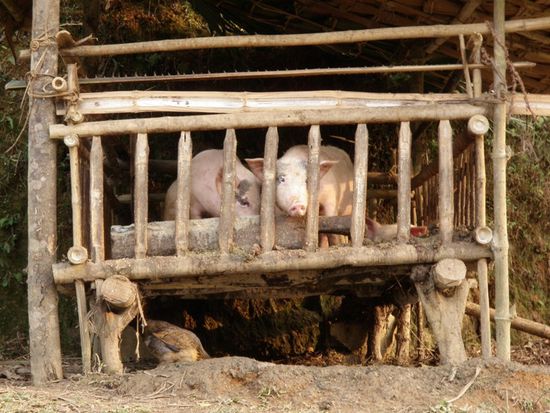 Und natuerlich musste mir zuliebe gleich eine kleine Schlange beim Feuerholz herumkriechen welche Bingh dann gleich ins Feuer legte und grillte. Er sagt das er sie als Nachspeise essen wuerde. Ich hatte eher Angst das sich die Mutter auch irgendwo in der Naehe herumtreiben koennte. Das Essen war jedenfalls sehr gut es gab Reis, Rind und Schweinefleich gegrillt sowie viel Gemuese. Bingh hat die Schlange wirklich gegessen, aber er sagt er isst sowieso alles . Hund, Katze, Frosch, usw. Zum schlafengehen gab es noch ein paar Glaeser Reiswein und um 20 Uhr siond alle im Bett gewesen. Ohne Ohropax haette ich nicht sehr viel geschlafen, aber so ist es halbwegs gegangen, auf das Wc wollte ich auch nicht gehen da ich die Schlange noch im Hinterkopf hatte. Dafuer war um 7 Uhr Tagwache und nach einem guten Fruehstueck ging es durch Wassefaelle bergauf zu noch hoeher gelegenen Doerfern. Der ganze Tag ging mit Wanderungen auf und am Nachmittag kamen wir zur unser naechsten Familie wo wir diese Nacht geschlafen haben. Wir wurden wieder freundlich begruesst aber diesmal mit Bier, den es gab in diesem Gebiet schon elektrischen Strom, eine Luxus wie einen Kuehlschrank und einen Zufahrtweg fuer Mofas. Diesen Abend wurde nach einem guten Abendessen schon um halb acht das Licht abgedreht und alle legten sich schlafen. Ich bin noch vor der Huette auf einer Stiege gesessen und habe ab 20 Uhr nirgends mehr Licht gesehen.