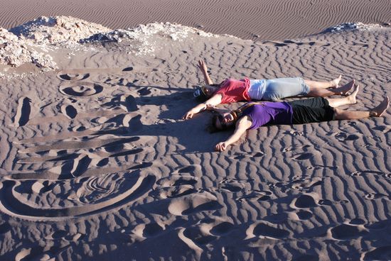 Zum Sonnenuntergang hat sich das Valle de la Luna doch ploetzlich mit horden von Touris gefuellt. Deshalb sind wir etwas abseites von der Strasse auf einen Berg geklaetttert und haben uns mit Sandmalerei bis die liebe Sonne dem Mond platz machen musste die Zeit vertrieben...