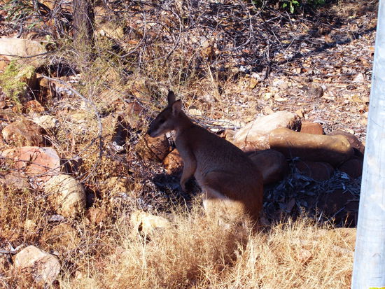 Vorbei an den ebenfalls sehenswerten Edith Falls (Lllewyn in aboriginal Sprache)ging es nach Katherine, wo wir "schnell" in unser Motel eincheckten und uns dann auf den Weg zur Katherine Gorge (Nitmiluk) machten. Leider waren wir (wie immer ) recht spät dran und so konnten wir nur einen kurzen Spaziergang zum "See" machen.Zur Entschädigung sahen wir dann auf dem Parkplatz ein kleines Känguruh, dass sich wohl einen weggeworfenen Apfel zu Gemüte führte.