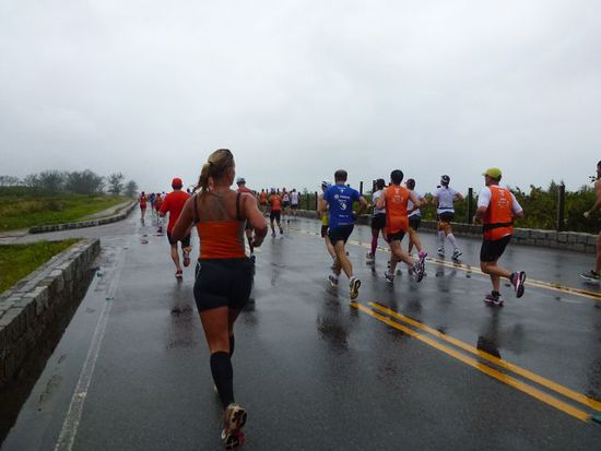 Kilometer 5, der Kilometerschnitt auf 5.40 hat sich eingependelt, wir traben fröhlich mit und rechnen uns trotz dem nun einsetzenden Sprühregen eine famose Schlusszeit um die 4 Stunden aus. Kilometer 10, aus dem Sprühregen wird Nieselregen, Wind kommt auf, an der fast Zuschauerlosen Strandpromenade erreichen wir Barra La Tijuca und weichen den ersten Wasserpfützen aus. Der Schnitt passt hervorragend, trotzdem wundern wir uns Beide, dass die Oberschenkelmuskulatur scheinbar noch immer nicht aus Ihrem Tiefschlaf erwacht ist, bei ein Fotosession rutscht der nasse Fotoapparat aus der Hand und fällt auf den Teer, es scheint er hat keine Lust mehr auf die letzten 30 Kilometer...wenigstens haben wir so ein paar unvergessliche Erinnerungskratzer.