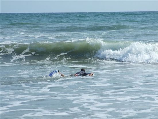 Am nächsten Morgen entdecken wir die Surfbretter von Hotelhüter Peter, vor uns im Meer brechen die Wellen, na also auf was warten wir noch. Während Anke sich vorerst mit dem Bodyboard vergnügt, paddelt Schetty schon mit kräftigen Armschlägen mit dem Surfbrett gegen die Wellen. Gefangen in seinen Erinnerungen von anno Dazumal in Biarritz vor 20 Jahren erblickt er am Horizont schon die perfekte Welle und paddelt mit den Wassermassen wissend im Rücken voller Elan los - catch the wave, in the center, jump on - oder wie war das noch?