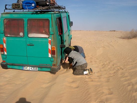 Obwohl es für uns recht eben war, fuhren wir immer wieder jetzt rechts, jetzt links, dann geradeaus, dann wieder links oder rechts. Markus und ich dachten, der wird schon wissen warum. Nicht so Jochen, aus dem brach es plötzlich heraus, das ist doch Scheiße, links rechts, links rechts, da fährt man volle Kanne bis die ganze Inneneinrichtung sich zerlegt hat. Und gab Vollgas! Der Guide klammerte sich an dem Haltegriff fest und rief immer wieder auf Französisch langsam, langsam. Doch Jochen war in seinem Element! Markus und ich saßen hinten auf der Bierbank und versuchten uns irgendwo fest zu halten. Doch plötzlich stoppte Jochen! Eine Felskante! Da konnte er nicht darüber fahren. Wir stiegen aus, so weit das Auge reichte, nach Osten und Westen, nirgends sah man eine Möglichkeit des Überwindens. Also hörte er wieder auf den Guide. Der führte uns wieder zurück auf den richtigen Weg. Nach einer längeren Zeit ließ er anhalten, der Guide stieg aus, ging auf eine kleine Düne und ich begleitete ihn aus Neugier. Unter den Füßen fühlte ich die Festigkeit des Sandes. Oben war der Sand sehr fest, je weiter man nach unten kam, umso mehliger wurde der Sand. Nun standen der Guide und ich oben auf dem festen Grund und winkten Jochen, er solle hier entlang fahren. Doch Jochen fuhr einfach Vollgas geradeaus in den Tiefsand zwischen den kleinen Sanddünen. Bis zum Bodenblech steckte der Wagen im Sand fest. Ich fragte ihn,