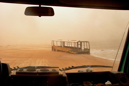 Wir fahren am Strand entlang und kommen an einem Bus oder was davon übrig ist, vorbei. Die Leute aus dem Bus gingen schwimmen und sich umsehen, als die Flut kam. Die Bewohner eines nahe gelegenen Fischerdorfes kamen zu Hilfe, als der Bus nicht mehr aus dem Sand kam. Doch alle Bemühungen waren vergebens, das Wasser unterspülte die Räder, der Bus sank ein. Sie mussten den Bus aufgeben.