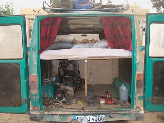 Endlich war es soweit! Wir wollten an diesem Tag zu unserer Fahrt in den Senegal aufbrechen. Das Fahrzeug war ein alter Mercedes Bus 508 mit provisorischem "Betteinbau", Gasherd und einem Schrank. Eine kleine Gartenbank wie man sie in Biergärten finden kann, diente als Rückbank. Das Bett war eine Spanplatte mit Schaumstoffauflage. Diese Platte stand auf diversen Kanthölzern, so dass unter der Platte genug Raum für einen 508er Motor mit Getriebe plus Schaltgetriebe vorhanden war. Das hatte natürlich einiges an Gewicht. Dazu kam natürlich noch das Gepäck für uns 3 Männer und einige leere Plastikkanister