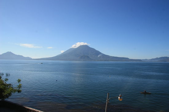 Der Lago de Atitlan ist wunderschoen gelegen. An seinen Uferseiten gibt es 3 groessere Vulkane.