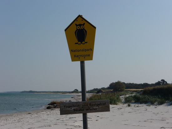 Da uns der Wettergott Petrus weiterhin hold war und auch der nächste Tag Sonne satt versprach, wollten wir heute zur Fahrradtour in Richtung Nationalparkgebiet Sundische Wiesen aufbrechen. Das Gebiet gehört zu Zingst und liegt etwa acht Kilometer entfernt. Bis zur Kernzone des Nationalparkgebietes in Pramort, das nur noch zu Fuß zu erreichen ist und während der Kranichsaison im Herbst sogar nur für eine begrenzte Zahl an Besuchern zugänglich ist, sind es nochmals runde 12 Kilometer. Wir haben uns also ganz schön was vorgenommen. Nach einem ausgiebigen Frühstück im Freien ging es also los in Richtung Osten. Immer auf dem Deich entlang strampelten wir gemütlich los. Immer wieder blickten wir auf die Ostsee, die wie ein glatter Spiegel vor uns lag. Auf der anderen Seite hinter dem Deich erstreckten sich zunächst die Häuser von Zingst und später ein ausgedehntes Waldgebiet. Wir erreichten den großen Parkplatz, ab dem es nur noch zu Fuß oder per Fahrrad weitergeht, um die Mittagszeit. Ein Ausflugslokal mit schönem, schattigem Biergarten bot sich für eine erste längere Rast an. Ein Alsterwasser (auf schwäbisch: Radler) und eine Bockwurst mundeten uns recht gut.