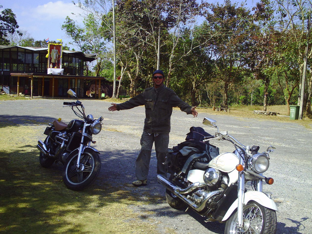 Endlich geht es los.Wir fahren Richtung Norden, Wir haben uns vorgenommen nicht mehr als 250 km pro Tag zu fahren. Nach ca. 2 Stunden Fahrt ne Speisepause, der Rainer `bestellt ein großes Leo (Bier). Weiter nach Phrachin Buri. Dort sind wir durch die Stadt gefahren, um ein Hotel zu finden. Der Rainer macht einen kleinen Fehler und liegt mit geprellten Rippen auf der Straße, Kupplungsgriff abgebrochen, Doch die thailändischen Biker waren sofort zur Stelle, ein paar Kabelbinder und dann weiter- eine Werkstatt finden. Nach 2 Stunden ist alles okay.Nettes Hotel 250 Baht. Ab zum Fluss, der durch die Stadt fließt, essen frisch vom Grill ( Achtung sau scharf !!!).