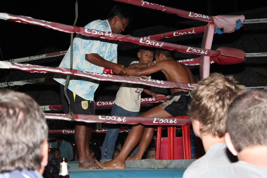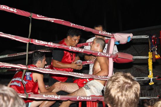 Abends um 20.30 Uhr gings dann per Taxi los an einen Muay Thai Boxkampf in die Kobra Muat Thai School nach Tong Sala. Patric, mein Vater und ich haben uns dort direkt Sitze am Ring gesichert und konnten die sieben Fights von ganz nah studieren. Von sieben Kaempfen gab es fuenf KO's und zwei Siege aufgrund von Punkten.