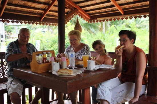Also am Morgen mal auf die Beine. 8.30 unter die Dusche und Gepaeck fertig gepackt. Dann unser Gepaeck auf den gemieteten Pick Up geladen und sich beim Fruehstueck den Wanzt vollgeschlagen....