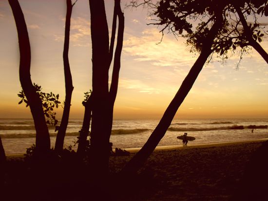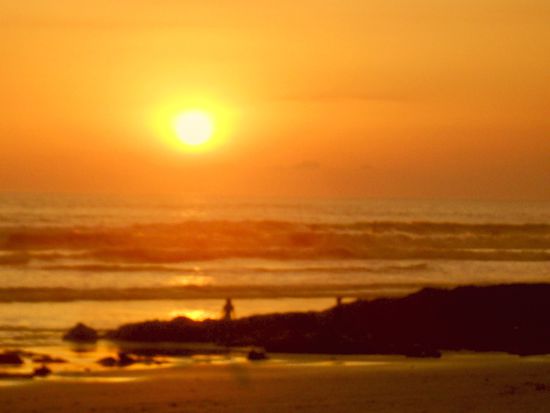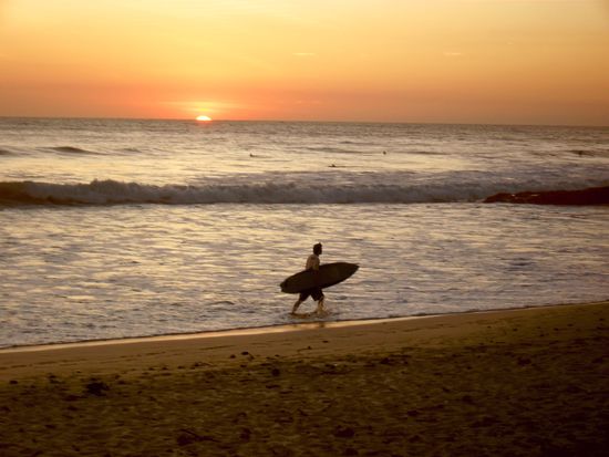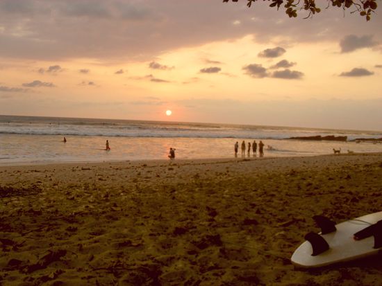 Morgens gg 9 Uhr runter an den Strand und bei low tide versuchen ein paar der kleinen Wellen zu surfen.(Naja, Surfen kann man das noch nicht wirklich nennen, die meiste Zeit bin ich mit rauspaddeln beschaeftigt und froh wenn ich mal laenger als 5 sek.auf dem Board stehe.!Gut dass Michael immer mit war und auf mich aufgepasst hat, bei einigen Wellen musste ich ganz schoen tief tauchen!) Mittags am Strand relaxen und was essen, nachmittags dann wieder surfen und jeden abend um halb sechs trifft sich die Bande aus dem Hostel am Strand ,um den Sonnenuntergang anzuschauen und gemuetlich ein Imperial zu trinken.
