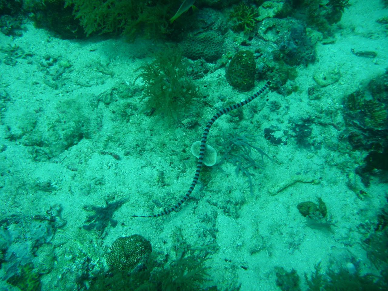 Diese Seekobra will sich in den Korallen einfach nicht fotografieren lassen. Da heisst es geduldig sein, denn irgendwann muss sie zum Atmen nach oben.