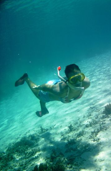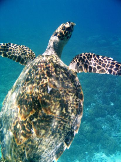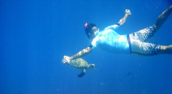 Das erste mal, als wir hier schnorchelten, schwamm eine riesige Schildkröte an uns vorbei... Ich bat die Laura ein Bild von mir und der Schildkröte zu machen, dabei hielt ich mich leicht am Panzer der Schildkröte fest und habe mich von ihr ziehen lassen... Als die Schildkröte sich plötzlich in Lauras Richtung drehte, habe ich noch keinen Menschen so schnell schwimmen sehen.. Also den Michael Phelps wäre um Längen geschlagen gewesen..