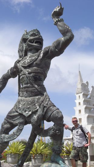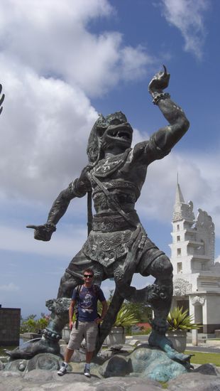 Da wir noch reichlich Zeit hatten, wollten wir noch nen Strand suchen. Kurz vor Uluwatu ging es rechts weg und schon waren wir am schönsten Strand den ich bis jetzt gesehen hab... Wir haben zunächst oben geparkt und sind dann etwa 300 abenteuerliche Stufen heruntergegangen. Unten angekommen hat es uns echt die Sprache verschlagen - eine kleine Bucht umgeben von riesigen Felsen, der Sand war fein wie Puderzucker. Es waren nur ein paar Einheimische da. Oberhalb der Bucht waren ein paar Häuschen in den Fels gebaut unter anderem das Restaurant. Dort haben wir ne Kleinigkeit gefuttert und die wirklich einzigartige Aussicht genossen.