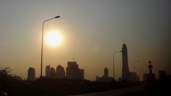Ich bin auf den Trichter gekommen den Chao Phraya mit dem Boot zu bereisen, was sehr sehr beindruckend ist... Bis zur naechsten Skytrain Station.. Da tuckert man etwa 20 Minuten an der Skyline von Bangkok entlang und dann ab in den Skytrain, der wie eine hypermoderne S-Bahn aussieht, die 20 Meter ueber den Strassen mit rasender Geschwindigtkeit durch die Stadt zischt.. Mit dem Skytrain erreicht man komfortabel und in Rekordzeit die anderen Sehenswuerdigkeiten der Stadt..