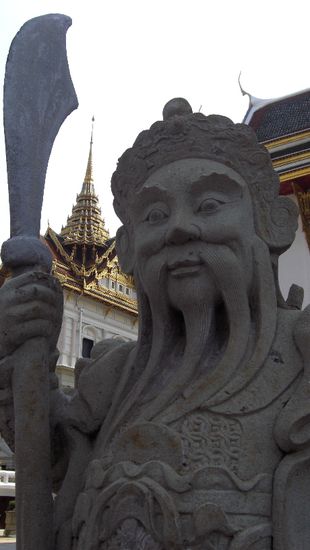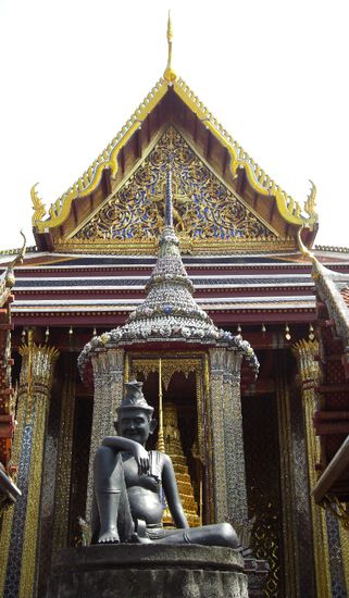 Dann gings zu einer der gigantischsten Anlagen die ich je gesehen habe.. Dem "Grand Palace" was urspruenglich die Residenz der thailaendischen Koenige war und jeder hat sich mit einer Gebeudegruppe ein Denkmal gesetzt.. Ein Gebeude ist beindruckender wie das andere und alle sind goldfarben, mit bunten Glasmosaik und den verschiedesten Bildern bemalt...