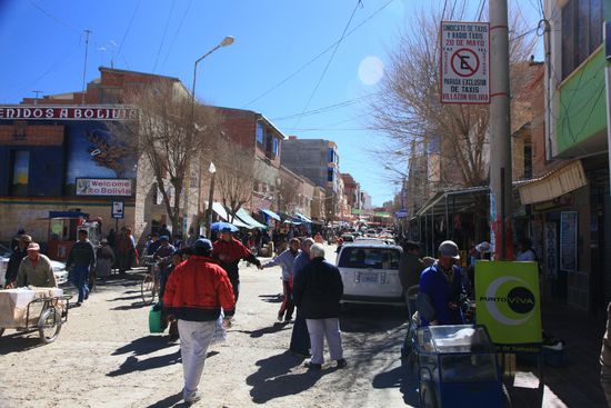 An der Grenze erst einmal ein Kulurschock. Waren bisher die Grenzuebergaenge etwas weiter auseinander, weil die Lebensfeindlichen Hoehen der Anden zwischen Argentinien und Chile lagen, waren sie hier an der Grenze zu Bolivien dicht beieinander. Und waehrend die Chilenisch argentinischen Grenzuebergaenge ruhige und ordentliche Plaetze waren Ugab es hier eine wuselnde Masse von Menschen, die v von der einen zu der anderen seite gingen. Indio Frauen mit Saecken voll beladen, Rucksacktouristen schleppten ihr hab und gut in zwei Rucksaecken durch die Gegend.