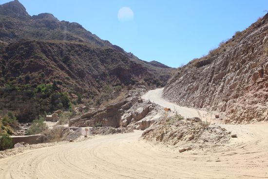 Es erwartete mich eine relativ gute Asphaltstrasse. Zuerst einmal musste ich meinen Fuehrerschein vorzeigen. Allerdings ist es der neue Plastikfuehrerschein. Ich bezweifele, das den irgend ein andere Beamter ausserhalb der EU versteht. Wie dem auch sei, die Daten wurden in ein Buch eingetragen, ich bezahlte 10 Bolivianos Maut (etwas mehr als 1 Euro), und konnte dann weiterfahren. Hm, ob ich wohl doch bis Potosi komme?Aber schnell wurden meine Hoffnungen zerstoert. Aus der vguten Asphaltstrasse wurde eine Schotterpiste. Sie war gar nicht einmal so schlecht. Es war bloss hoellisch staubig. Und es herschte viel Bus und LKW Verkehr. Ausserdem war die Strassenfuehrung sehr spektakulaer. Die Strasse fuerte hinunter in ein Tal, und wand sich dann in engen Kurven den Berg hinauf. Neben der Strasse gaehnte ein einige hundert Meter tiefer Abgrund. Und eine Begrenzung gab es nicht. Auch deshalb fuhr ich nicht schnell. So um die Tempo 30 war mir genug. So konnte ich noch ein wenig die Landschaft anschauen, oder von Zeit zu Zeit mein Visier saubermachen. Neben der Strasse waren auch viele grosse Kakteen. Ein weiterer Grund nicht allzu schnell zu fahren.