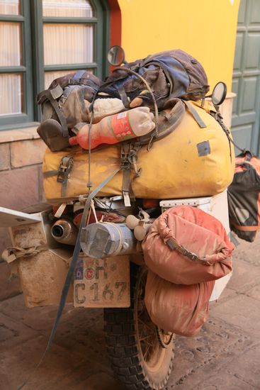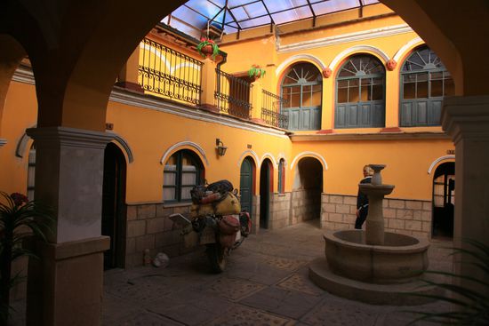 Dann endlich Potosi. Hier sind dieb Strassen noch enger. Und ausserdem fuehren sie endweder steil bergauf, oder Bergab. Kurz, ein ziemliches Chaos. Durch Zufall fand ich dann mein gewuenschtes Hotel. Es hatte einen schoenen grossen Patio. Dort parkte ich mein Motorrad. Genau vor meinen Zimmer. Doof. Es gibt kaum Einzelzimmer. Immer muss ich dann ein Doppelzimmer nehmen. Unguenstig fuer mich.