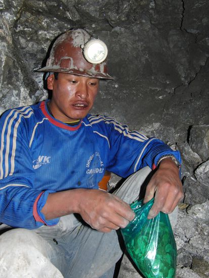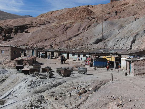 Dafuer erbitten sie sich dann Schutz vor unfaellen, und vor allen Dingen ein reichhaltiges Erz. Denn dieses steigert ihren Gewinn. Auch fuer mehr Fruchtbarkeit opfern sie einen Teil ihrer Rationen. Man beachte den riesigen Penis der Figur. Sie arbeiten in kleinen Gruppen zusammen. Keine Frauen. Da sind sie ziemlich Macho. Meine Frau ist zu Hause und kuemmert sich um die Kinder. Wenn hier Frauen arbeiten wuerden, dann haette ich ja zwei Frauen. Eine hier, und eine zu Hause. Und ausserdem moechte ich meine Frau nicht teilen. Das war die uebereinstimmende meinung von allen Leuten die wir dort getroffen hatten. Und gleichberechtigung hin oder her, dass ist kein Job den ich einer Frau zumuten moechte. Die Arbeit ist hart. Und sehr anstrengend. Kinder und Jugendliche beginnen mit den anspruchslosesten Arbeiten. Im laufe der Zeit steigert sich ihr Wissen, und ihre Erfahrung, und sie arbeiten dann an den wichtigen Stellen. Zum Beispiel den Wagen aus dem Schacht fahren, oder die Loecher fuer die Sprengungen bohren. Bis zu 20 Stueck, und 50 bis 100 cm tief. Da sind die heutigen Pressluftmaschienen schon eine gewaltige Hilfe. 2-3 Loecher in einer Viertelstunde. Waehrend es von Hand schon fuer 20 cm eine viertelstunde dauert. Alt werden hier die wenigsten. Maximal 20 Jahre. Dann sind sie fertig. Der Staub, die Hitze, die harte koerperliche Arbeit. Aber sie verdienen gut. 200 bis 800 Bolivianos die Woche. Je nachdem wie wertvoll das Erz ist. Das sind 22 bis 78 Euro die woche! Eine menge Geld hier. Aber die Mienenarbeiter leben heute. Sie sparen nicht fuer das lange Leben, sondern wenn sie Geld haben, dann geben sie es auch aus. Teure Schuhe, Fernseher, Alkohol. Und doch haben alle eine Familie und wenigstens 4 Kinder. Sie sind ja noch Jung. Mitte 20 die meisten die wir sahen. 6 Tage die Woche kommen sioe hier her. Ziehen sich in einer kleinen Huette um, und kauen dort Koka. Um die Kraft und Konzentration zu steigern, und das hungergefuehl zu betaeuben. Morgens essen sie zwei drei Portionen zum Fruehstueck. Und dann erst Abends wieder etwas. Da braucht es die Koka, und Zigaretten, um ueber den Tag zu kommen.
