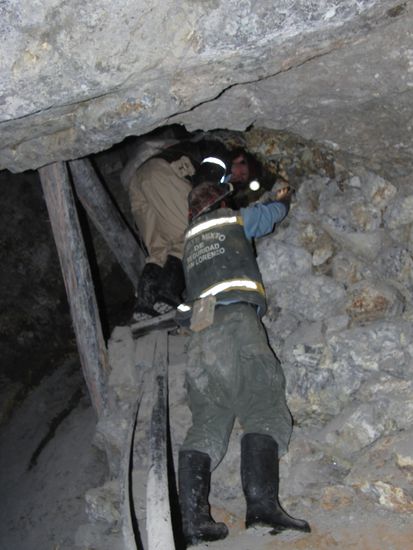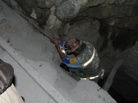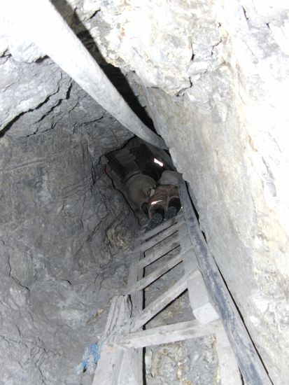 Aber dann begann der Spass erst so richtig. Denn ueber Leitern und ziemlich gewagte Konstruktionen kletterten und rutschten wir zwei Etagen nach unten. Dort wo gearbeitet wurde. Einer nach dem anderen hangelte sich die schraeg stehenden Leitern hinunter, hielt sich an den Steinen fest, und rutschte mit den Knien durch den Staub.