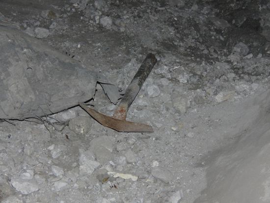Und dann hinein. Die Gaenge waren teilweise ziemlich niedrig, und Pressluftschlaeuche, Stromkabel, oder Tragbalken hingen im wege herum. Wie gut das ich einen helm aufhatte. Sonst haette ich wahrscheinlich heute noch Kopfschmerzen.