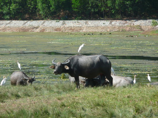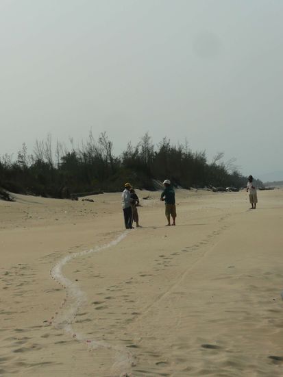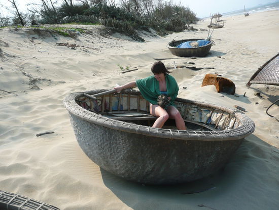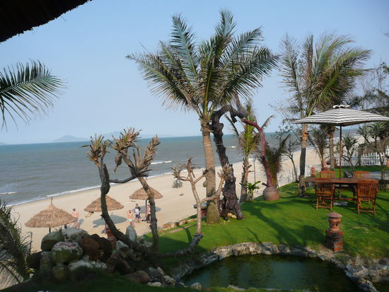 So jetzt wieder Heiko mit nem Bericht. Leider etwas verspaetet. Nach ner etwa vierstuendigen Busfahrt in einem Open-Tour-Bus kamen wir erholt in Hoi An an. Die Zimmer hatten wir schon in Hue ausgemacht, also hielt der Bus gleich vorm Hotel Grassland. Ist ein gutes Hotel mit nem Pool, den wir nie benutzten,aber preiswert und gut.. Abends gings ins Stadtzentrum, wo wir irgendwo etwas asen und dann noch zu einem Festival an nem Strand gehen wollten, den wir nicht fanden. Aber sonst wars ganz gut. Hoi an hat ne wirklich sehenswerte Innenstadt, die touristisch gut erschlossen ist. Beruehmt ist der Ort fuer seine guten Massschneider. Gabi hat sich gleich mal n Kleid anfertigen lassen. Gesehen hab ichs noch nicht. Am naechsten Tag gings dann nach dem wir fruehstueckten in 2 Gruppen los. Phillip und Alex versuchten in Da Nang ihr Glueck ein Zugticket fuer die Weiterfahrt nach Nha Trang zu ergattern. Es gab nur noch eins fuersoft seats. Dazu spaeter. Wir versuchten ne billige Bootstour zu den Cham Islands am Hafen zu ergattern, was komplett ins Wsser fiel. Dafuer hab ich auf nem schoenen Markt ein Ho Chi Minh T-Shirt erstande. Huebsch. Danach gabs erstmals Badespass. Jubel! Wir fanden mit den Fahrraedern nen netten Sandstrand in Richtung Da Nang, der auch ziemlich menschenverlassen war. Nur manchmal verirrte sich ein Badegast in unsere Naehe. Und der Hausmeister des dahinterliegenden Schulungszentrum brachte unds auch mal ein Bier und mir persoenlich nen lustigen Ananasaft vorbei. Abends fanden wir uns in neinem Restaurant am Hafen wieder, wo wir ein einheimisches 5Gaenge-Menue verdrueckten, ausser Marco, der etwas Magenprobleme hatte. Am naechsten Morgen verdrueckten Heiko und Phillipe zum Fruestuck die einheimische Spezialitaet Cau Lau, die angeblich mit Quellwasser aus Hoi an zubreitet wird. Ich fands fuer ein Fruehstuecksessen ziemlich ftettsch, aber es schmeckte lecker, wie fast alles hier. Dann mieteten wir uns ein Mofa fuer 7$ und brausten abe nach My Son. Im Vietnamesischen Strassenverkehr gibt es bestimmt viele Regeln, die aber scheinbar keiner einhaelt. Staendig kommen Leute ohne zu gucken aus den Nebenstrassen, auf der eigene Fahrbahnseite entgegen, sogar in Einbahnstrassen. Wir gewoehnten uns mit viel Hupen schnell diese Fahrweise an und versuchten die Einheimischen zu uebertrumpfen, was nie gelang. Nach ca. 50 km (im Reisefuehrer standen 32) kamen wir bei drueckender Hitze in My Son an. Alsoehrlich gesagliegen da groesstenteils fast nur noch Ziegelhaeufen in wunderschoener Landschaft rum, aber mit unserem Eintritt unterstuetzen wir auf jeden Fall die Restaurierung..Danach gings Richtung Da Nang zu den Marmorbergen. Dass war fuer mich jedenfalls ein absolutes Highlight. Das ganze umliegende Dorf baut Marmor ab und meiselt schoene Statuen zum verkaufen, die ber nicht in unseren Rucksatz passten. Die Tempelanlage am\im Berg war einfach fantastisch und wunderschoen. Auf jeden Fall sehenswert. Sollte in keiner Vietnamtour fehlen. Dann duesten wir wieder zurueck nach Hoi an, denn wir mussten am Abend noch zum Nachtzug nach Nha Trang.Zur Fahrt im Nachtzug aeussert sich Gabi, denn ich hab ganz gut geschlafen in ner ziemlich engen Sitzmoeglichkeit. Na dann bis denne!!