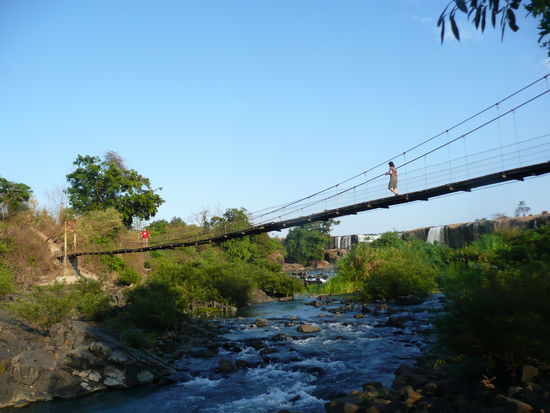 Zwischen den Pfahlhaeusern standen dann auch gleich ein paar Elefanten rum, die aber gerade ihre gesetzliche Mittagspause hatten. Die verbleibende Stunde nutzten wir fuer die weitere Erkundung. Ein Gewirr von Haengebruecken ueber Stromschnellen lud ein, unser Gleichgewicht zu pruefen. Wir sahen scheinbar leidend aus, denn uns wurde gleich ein Trink von einer einheimischen Familie angeboten. Ein Spezialgetraenk aus einem Steintopf, der nach Alk roch. mmhhh