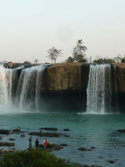 Das Einchecken klappte dann wunderbar, nur das unser Englisch nicht verstanden wurden und umgedreht genau so. Macht nix, vielleicht klappt es ja trotzdem mit unseren geplanten Ausfluegen und dem Ticket nach Saigon?! Der Tag war noch jung, guten Mutes suchten wir was zu essen und ein Tourismusbuero fuer moegliche Ausfluege. Beides klappte. Am fruehen Nachmittag sassen wir im Kleinbus zu einem der groessten Wasserfaelle Vietnams. Ein paar Treppen.. trotz Trockenzeit tosste die Gischt (nicht Gicht) herunter.