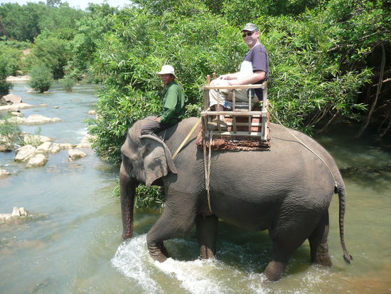 Der Elefant liess uns jedenfalls trotzdem hinauf (bequen ueber ein Aufstiegsgeruest) und dann ging die Schaukelei los...