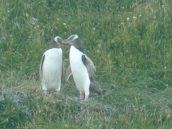 dann kam das highlight, die gelb-augen-pinguine. an einem einsamen strand, kommen die in der daemmerung an den strand zurueck. nacheinander watscheln sie dann zu den strauchern, schauen links und rechts, ob auch kein seeloewen in sicht sind und strecken ihre fluegelchen aus, um sich zu kuehlen.