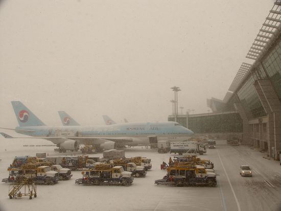 Ein paar angenehme Flugstunden über der "Sowjetunion" und 2 weniger gute Essen später bin ich nun im verschneiten Seoul-Incheon. Kein Wetter um noch einen Ausflug zu machen.