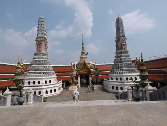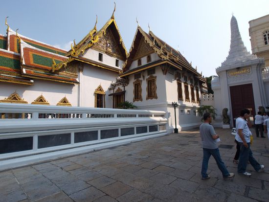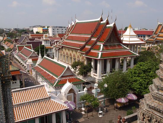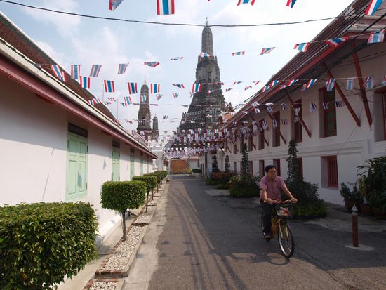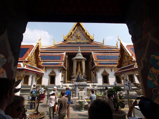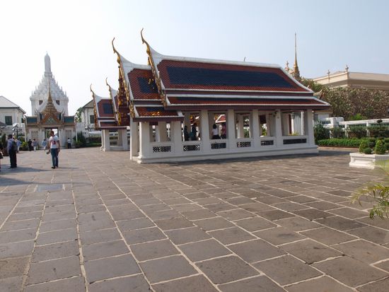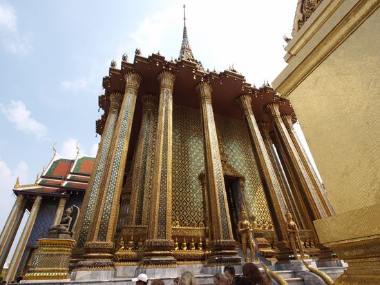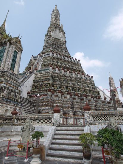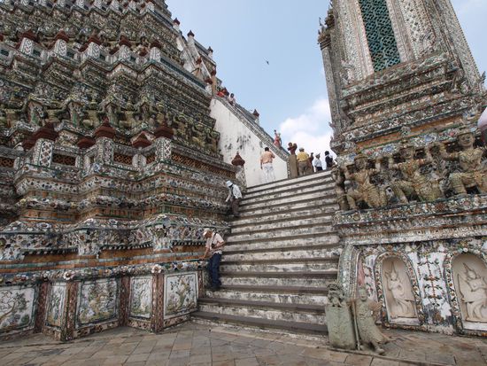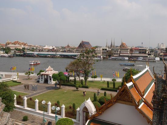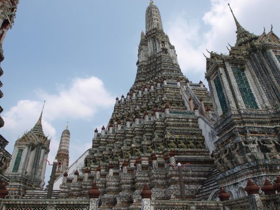 Heute ist also der erste Besichtigungstag. Geplant sind Wat Arun, Wat Phra Chetuphon, der Grand Palace und der Tempel mit dem Emerald Buddha. Das Taxi (Preis für ca. 4 km = 2 €) bringt mich zum Wat Arun wo ich meine Tour starte. Thailändische Tempel sind in ihrer Bauart wahrscheinlich die aufwändigsten Gebäude der Welt. Ein Aufstieg über die steilen Stufen zur 2. Plattform, die dritte ist nur mehr durch eine Klettertour erreichbar, wird mit einem traumhaften Ausblick über die Stadt belohnt.