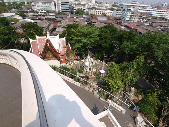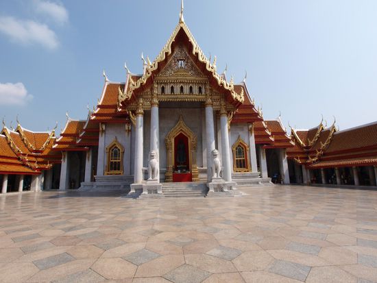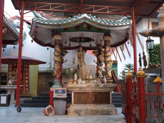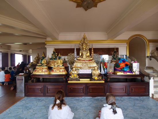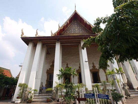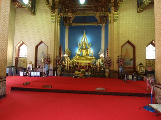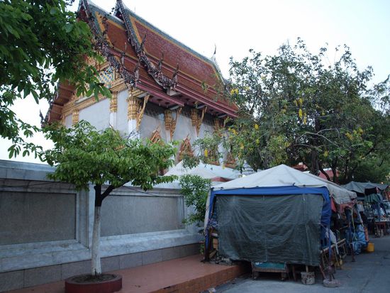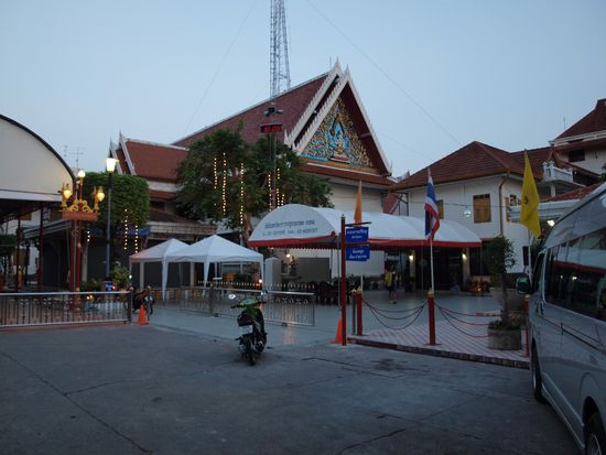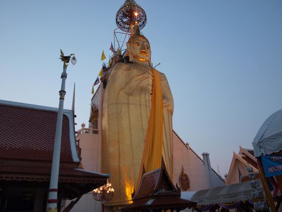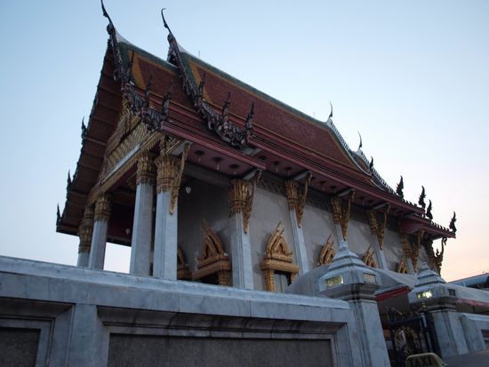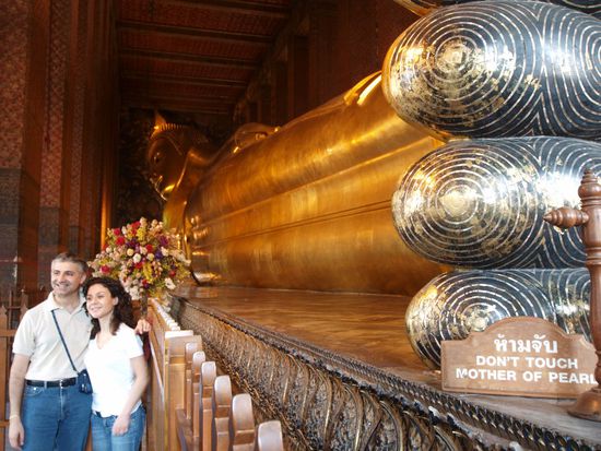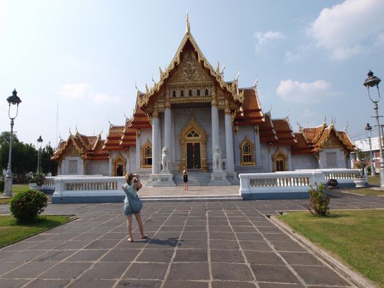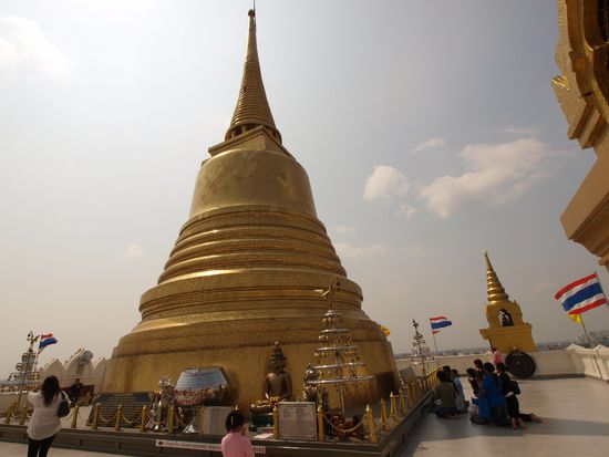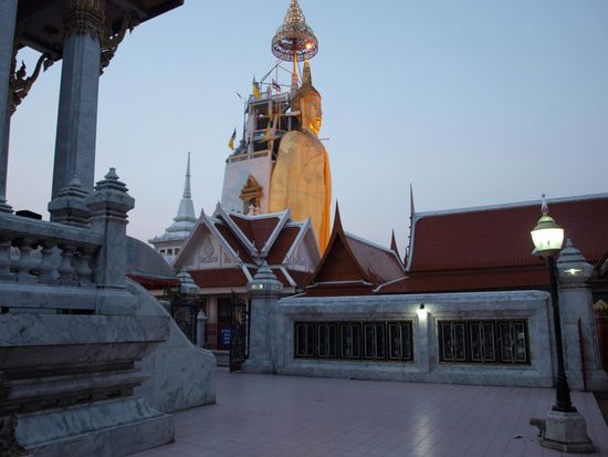 Heute stehen der sitzende goldene Buddha, der Golden Mountain Tempel - die zweite Klettertour, der Marbel (Marmor) Tempel, der große stehende goldene Buddha, und eine Expressbootfahrt auf dem Chao Praya auf dem Programm. Der sitzende Buddha befindet sich in einer Seitengasse der Altstadt Bangkoks und ist ohne TUK TUK vermutlich sehr schwer zu finden, aber jede Sucherei wert. Soviel Ästhetik ist echt eine Seltenheit. Die Klettertour zum Golden Mountain Tempel in der prallen Sonne Thailands wird durch einen faszinierenden Ausblick auf Bangkok und Fotos von einer goldenen Glocke belohnt. Der Marbel Tempel ist eine der kleineren Sehenswürdigkeiten ist aber jeden Besuch wert! Der stehende goldene Buddha ist wieder ein Highlight und die Bootsfahrt ein Erlebnis. Für ganze 13 Baht (d.s. 30 Cent) fährt man ca. 3 km auf dem Chao Praya und kann dann an der Anlegestelle des Oriental Hotels aussteigen um im Veranda Cafe auf eine Kleinigkeit einkehren. Übrigens die Preise für Essen und Trinken machen ca. die Hälfte der Restaurantpreise des Lebuas aus. Ein Fußmarsch zum nahegelegenen Hotel beschließt den nächsten ereignisreichen Tag.