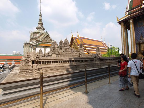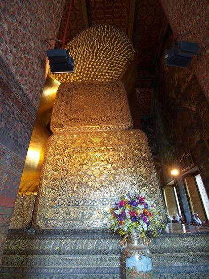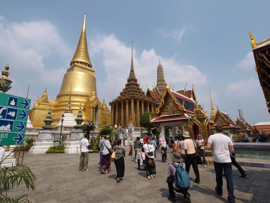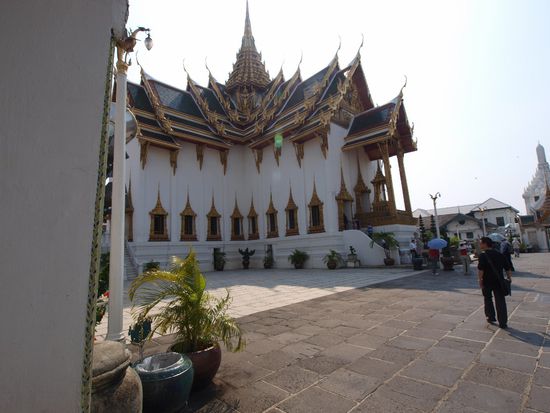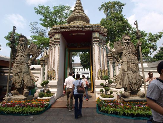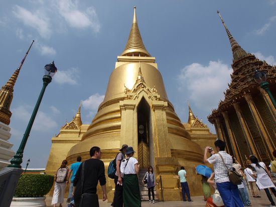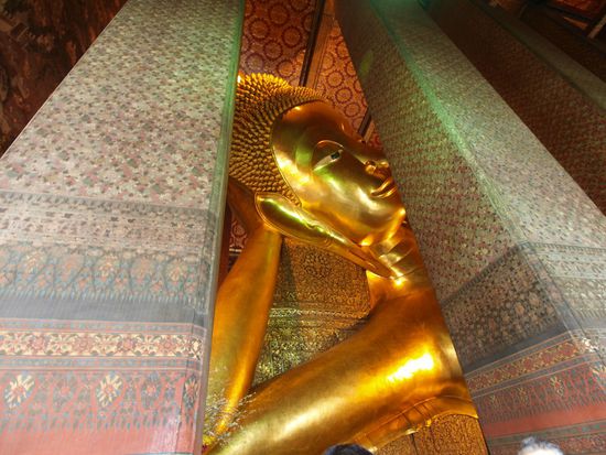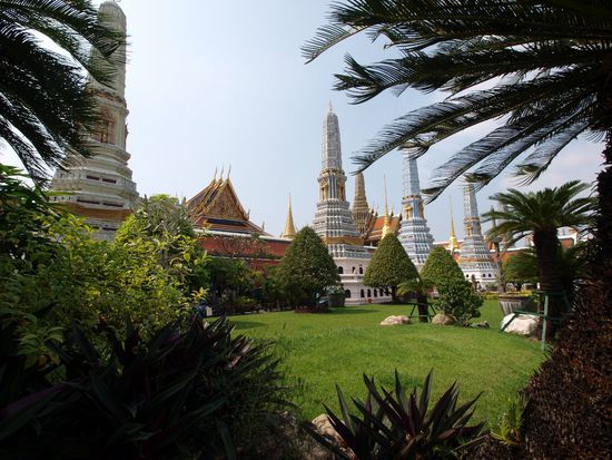 Mit der Fähre über den Chao Praya dem Hauptfluss Bangkoks erreiche ich den zweiten Punkt den meines Tourplans den Wat Phra Chetuphon mit dem liegenden Goldbuddha. Schlicht und einfach gigantisch! Kurze Pause im Garten des Wats und dann geht es zu einem Weiteren Höhepunkt des heutigen Tages dem Grand Palace mit dem Wat Phra Kaew, dem Tempel mit dem Emerald Buddha. Auf dieser Tour jagt ein Höhepunkt den vorherigen. Inzwischen bin ich schon reichlich müde und durstig, kaufe mir ein Getränk, setze mich also wie es sich gehört auf eine Parkbank, beschließe mir ein Taxi zu nehmen und den heutigen Tag am Pool des Hotels ausklingen zu lassen. Aber wie das Leben so spielt es kommt 1. Alles anders und 2. Als man denkt. Ein Thai in ungefähr meinem Alter setzt sich zu mir und fängt ein Gespräch mit mir an: Woher ich komme, was ich in Thailand mache, was ich alles schon besichtigt habe und so weiter. Ich sage ihm dass ich vorhabe Bangkok zu besichtigen dann nach Chang Mai fahren will und den Aufenthalt in Phuket ausklingen lassen wii um nach Hongkong weiter zu reisen. Er gibt mir den Tipp dies über das staatliche Reisebüro TAT (Touristik Authority of Thailand) zu tun. Ein Goldtipp wie es sich herausstellen sollte! Also schnell noch ein TUK TUK organisiert, den Preis mit seiner Hilfe ausgehandelt (ca. 1 € für 2 Stunden) und ab auf eine Stadttour; zuerst ins Reisebüro, dann ins Hotel Kreditkarten holen, zurück ins Reisebüro, Reise bezahlen, auf einen Kaffee mit dem Fahrer in den Sanam Luang Park zurück ins Reisebüro die inzwischen fertigen Reisenterlagen holen, dann zu einer Restaurantempfehlung des Reisebüromitarbeiters in dem ich nach der Verabschiedung meines Fahrers der sich über ein 3€ Trinkgeld zum ausgemachten 1€ Fahrpreis wie ein kleines Kind zu Weihnachten freut ,noch ein köstliches Fisch- und Seafoodessen zu einem Preis für den man in Österreich gerade einmal eine Portion Sushi bekommt, schlemmen kann.