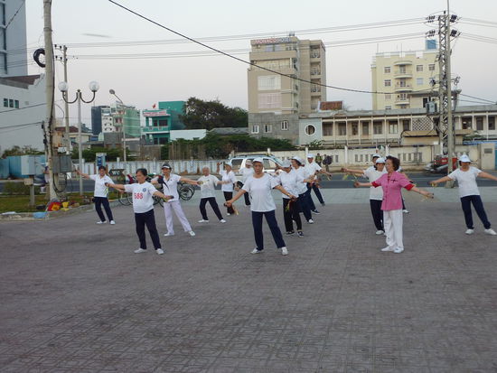 Umsteigen mussten wir morgens um 5:30Uhr in Nha Trang, einer Stadt direkt am Meer. Als Entschädigung für die unterbrochene Nacht bekamen wir den Sonnenaufgang zu sehen und die Einheimischen beim Morgensport am Strand!