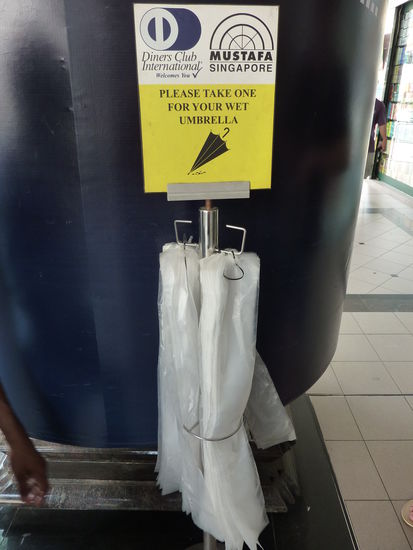 Vor dem Mustafa-Center einer riessigen Shoppingmall gibt es extra Plastikhuellen fuer Regenschirme! Nie wieder nasse Taschen